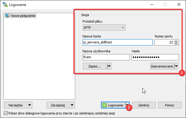 W trakcie instalacji serwera FiveM otrzymaliśmy dane użytkownika SFTP/SSH.