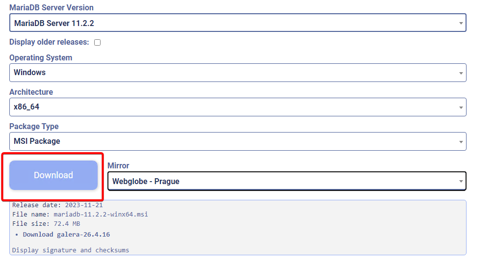 - Przejdź na oficjalną stronę MariaDB i pobierz wybraną wersję serwera baz danych.