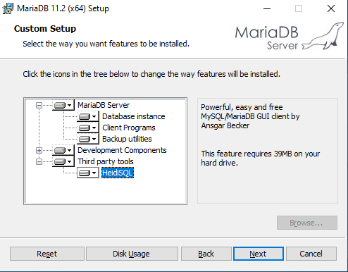 - Wybierz ścieżkę instalacji usługi MariaDB oraz wymagane składniki, a następnie przejdź dalej.