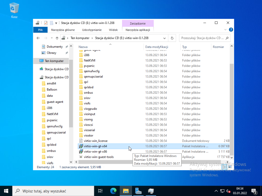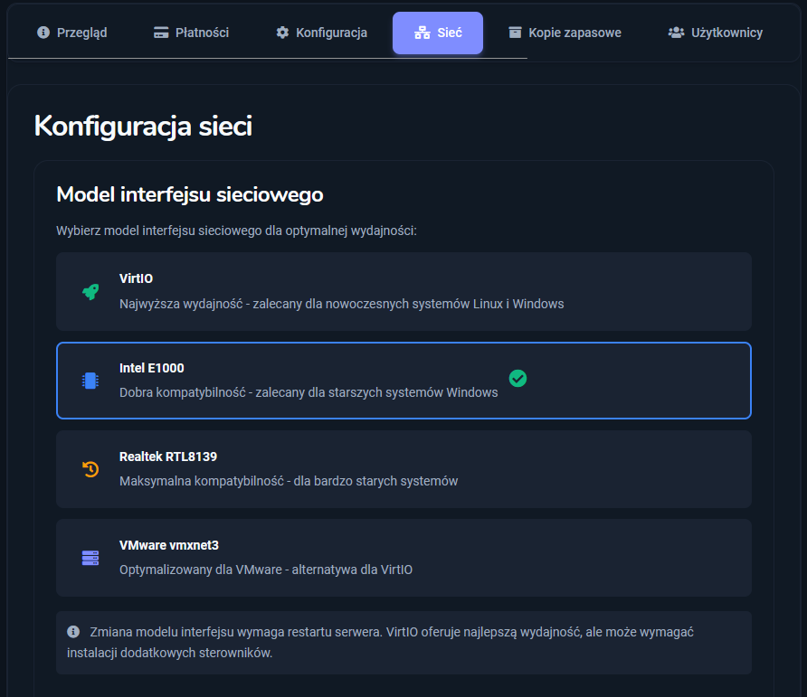 W sekcji „Model interfejsu sieciowego” zobaczysz listę dostępnych modeli kart sieciowych, wybierz model „Intel E1000”.