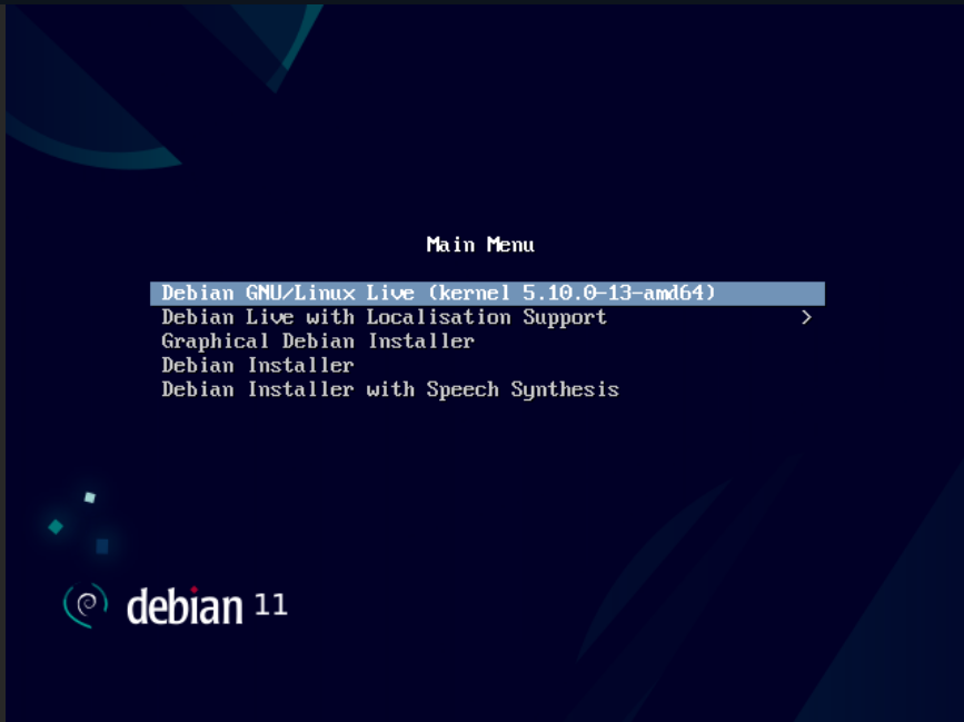 - Następnie ukaże Ci się ekran Debiana. Wybierz pierwszą opcję i czekaj na uruchomienie.