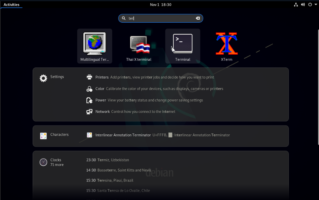- W lewym górnym rogu wybierz "Activities" i wyszukaj Terminal.