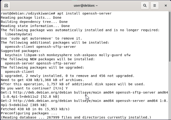 Instalacja serwera OpenSSH i pobieranie odzyskanych plików