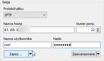 - Uruchom program WinSCP i zaloguj się korzystając z hasła ustawionego w punkcie drugim.