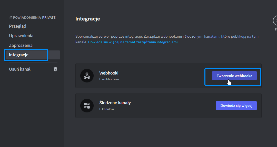- Z listy wybierz „Integracje”, a następnie kliknij „Utwórz Webhook”.