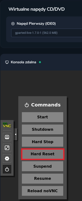 - Z menu po lewej stronie konsoli wybierz zakładkę Commands, następnie kliknij Hard Reset i potwierdź wyskakujące okno.