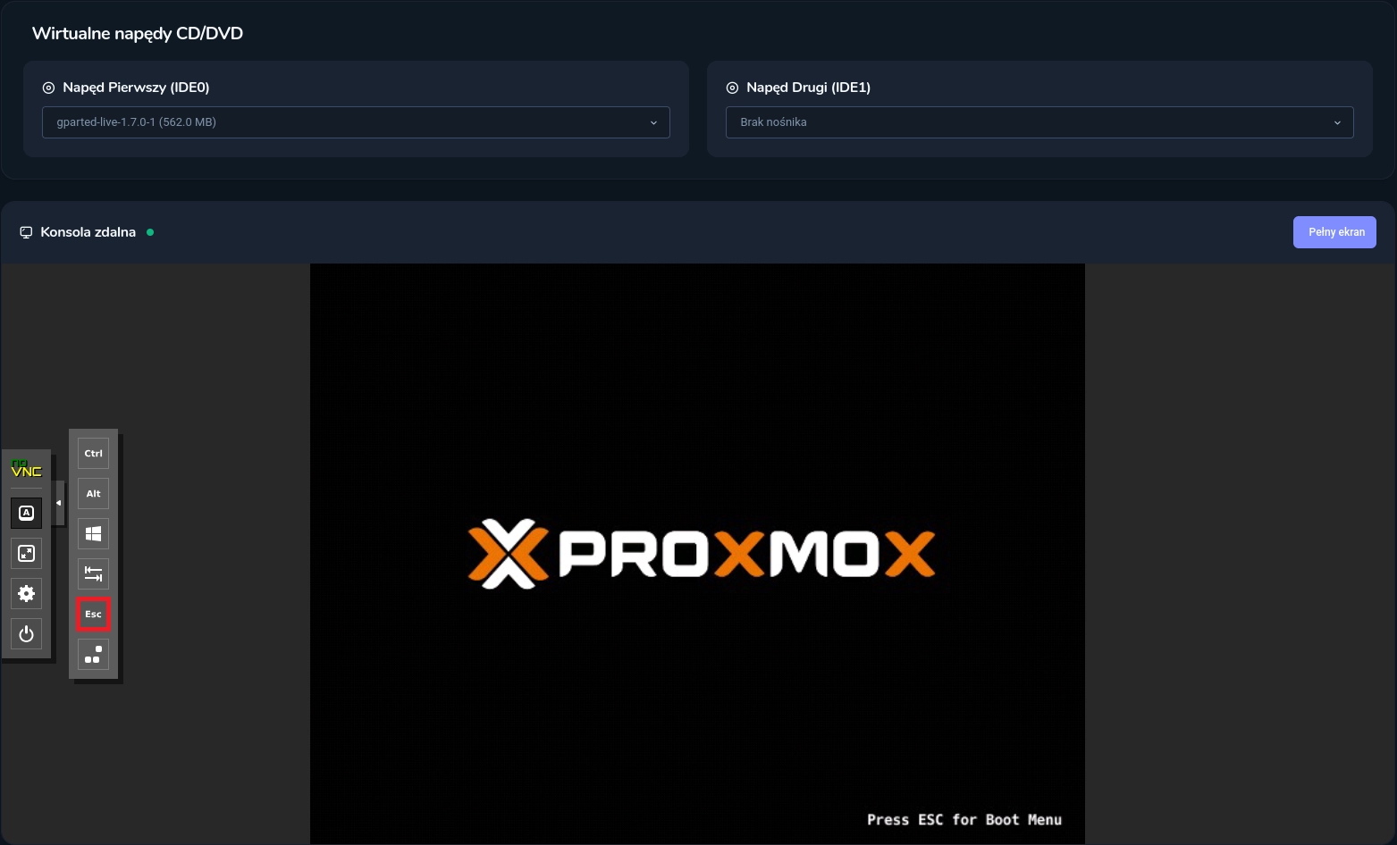 Klawisz ESC należy nacisnąć bardzo szybko – dokładnie w momencie, gdy na ekranie pojawia się logo Proxmox. Jeśli przegapisz ten moment, konieczne będzie ponowne wykonanie Hard Reset.