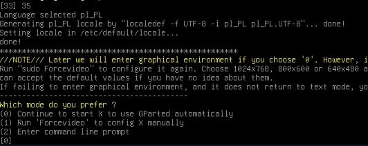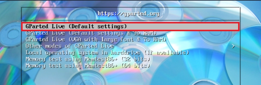 - Następnie przeniesie nas do GParted, tutaj wybieramy GParted Live (default settings).