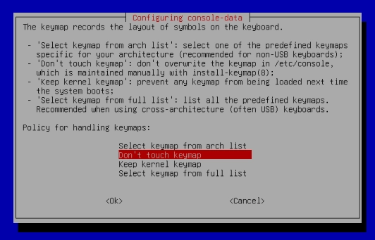 - Gdy pojawi nam się informacja “Configuring console-data” wybieramy opcję “Don’t touch keymap”.