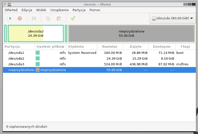 - Końcowo nasze "nieprzydzielone miejsce" powinno znajdować się bezpośrednio pod partycją.