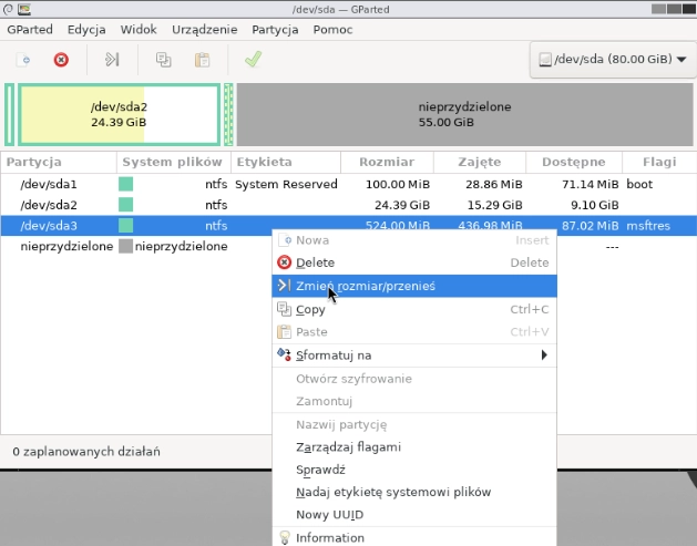 Zanim przystąpisz do zmian na partycjach, wykonaj kopię zapasową ważnych danych. Wszystkie operacje wykonujesz na własną odpowiedzialność!