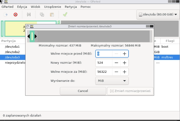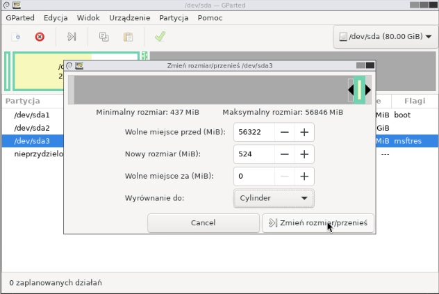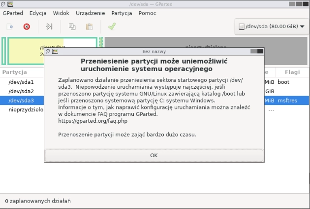 - Klikamy "Zmień rozmiar/przenieś". Wyświetli się komunikat z ostrzeżeniem, klikamy OK.
