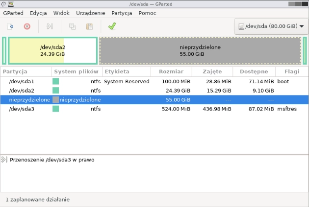 Niestety, pomiędzy „nieprzydzielonym” a partycją systemową (domyślnie będzie to partycja bez flag po prawej stronie aplikacji) znajduje się inna partycja. Dlatego najłatwiejszym, najszybszym i najbezpieczniejszym sposobem będzie przesunięcie jej - przejdźmy dalej.