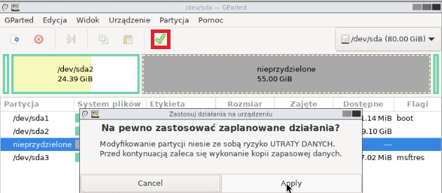 - Klikamy zielonego „ptaszka” u góry. Następnie wyświetli się komunikat z pytaniem, czy na pewno zastosować zaplanowane działania. Klikamy Apply.