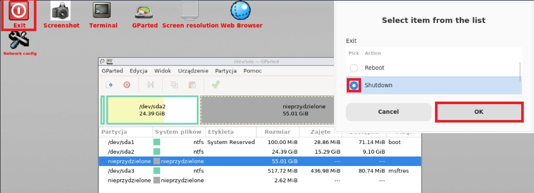 - Klikamy "Exit" w lewym górnym rogu ekranu a następnie wyświetli się okienko, wybieramy Shutdown i klikamy OK.