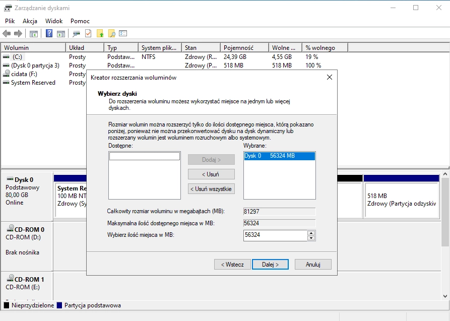 - Automatycznie powinno wyświetlić się okienko, gdzie widzimy wszystkie nasze dyski łącznie z miejscem nieprzydzielonym.